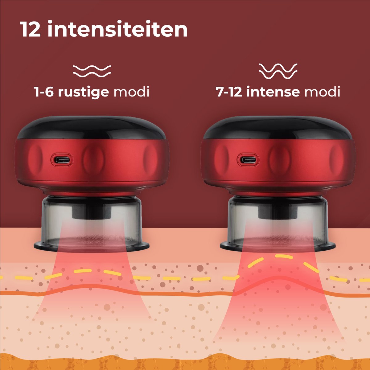 Het apparaat combineert drie verzorgingstechnieken in één: cupping, schrapen (gua sha) en roodlichttherapie. Zo stimuleer je de huid, verbeter je de doorbloeding en ondersteun je het herstel van spieren en weefsels.